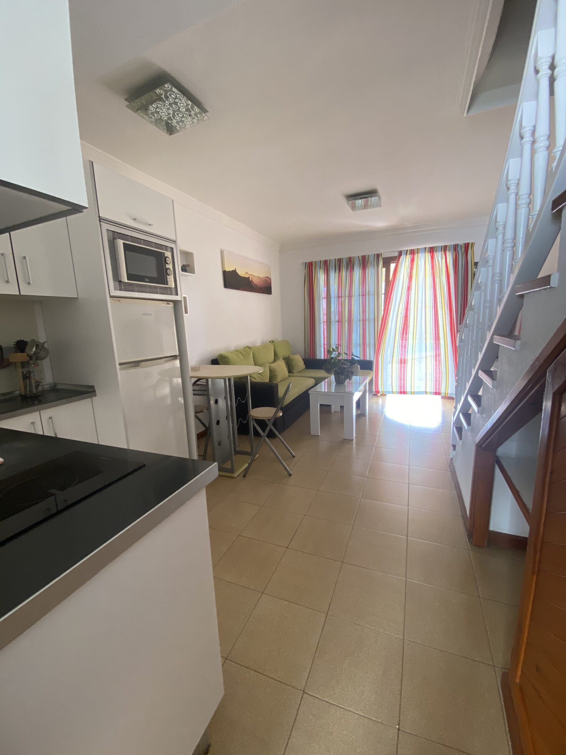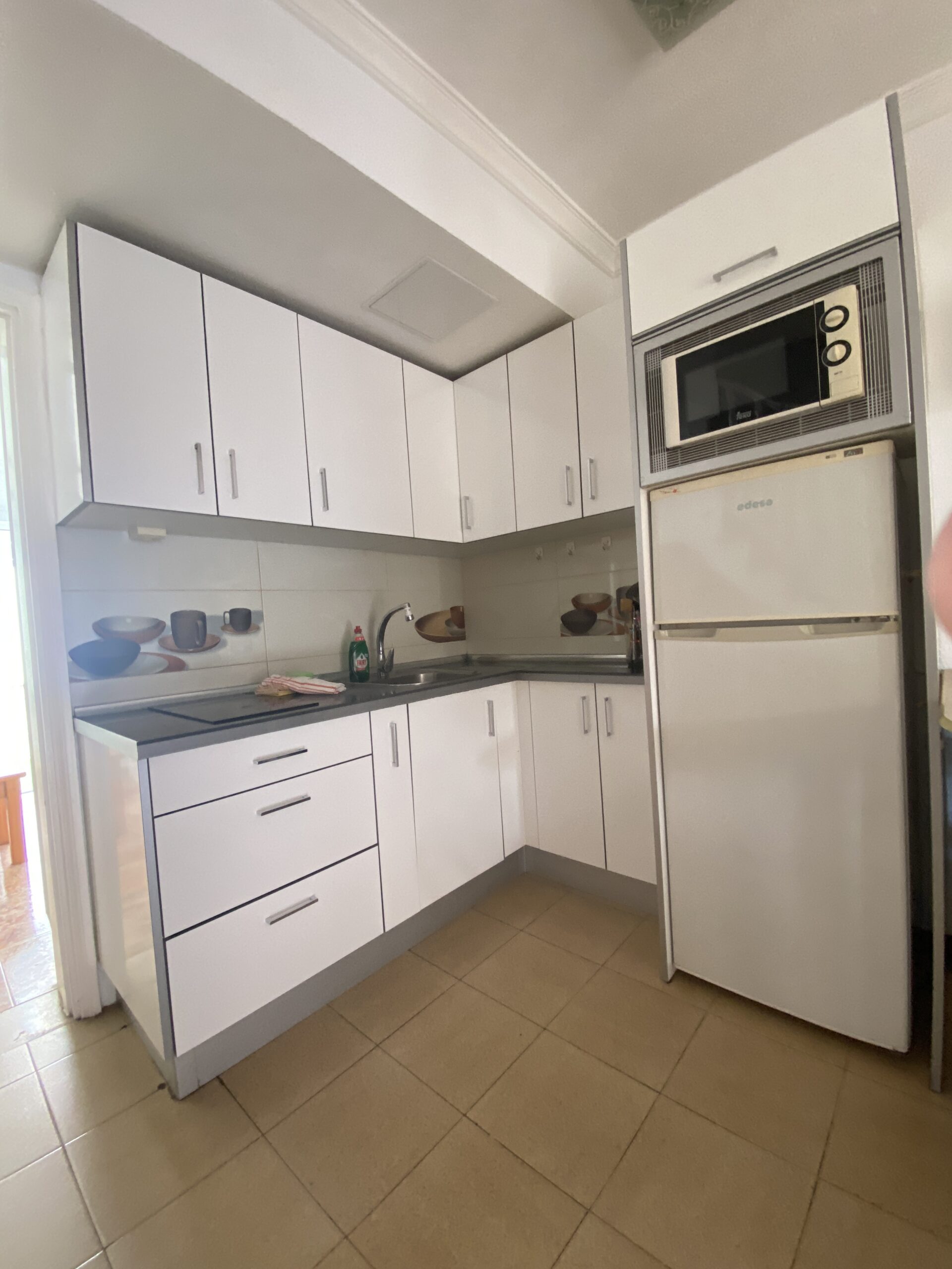 Cocina totalmente equipada, con microondas, nevera y utensilios de cocina.